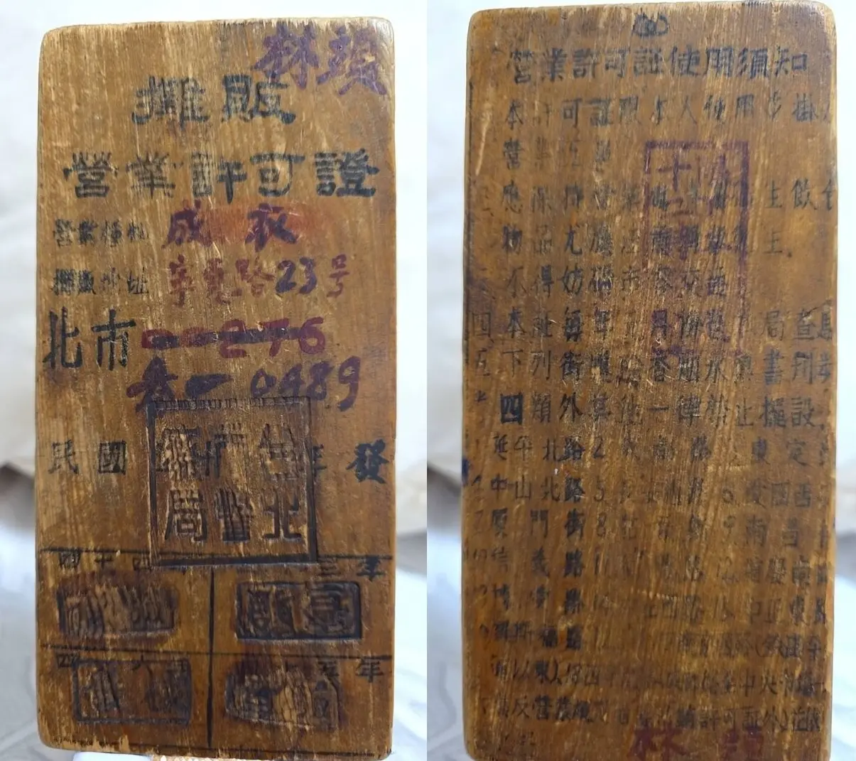 飽經風霜的木製攤販證,見證著寧夏夜市的歷史。林定國說:「這是日治時期留下的,鬍鬚張當年就是持這個擺攤。」