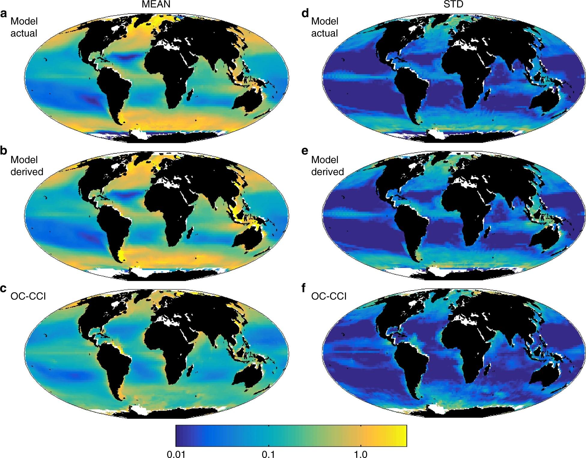 英國國家海洋中心的研究員B B Cael研究過去20年NASA衛星數據,打造兩個版本的地球。一個假設沒有氣候變遷,另一個則是承認人為暖化的影響。結果顯示,全球超過56% 的海洋已經在過去二十年間顏色發生改變。這片面積,比全世界陸地還要大。