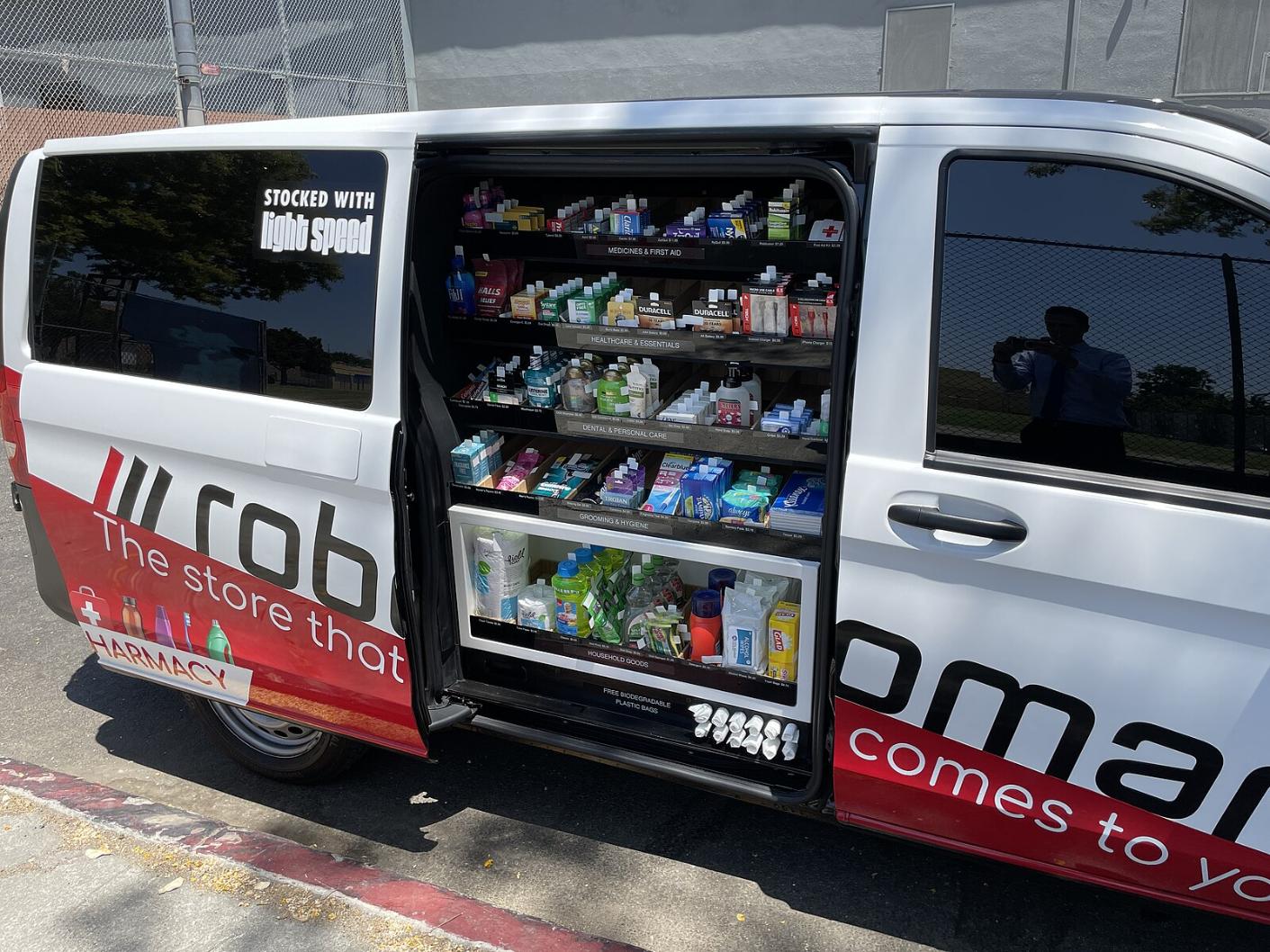 2021 年 Robomart 在加州推出兩種移動市集模式,一款主打零食飲料車、另一款藥妝日用品車,雖車輛有司機,但消費者可用手機叫車、到點打開車門、選商品、結帳。照片來源