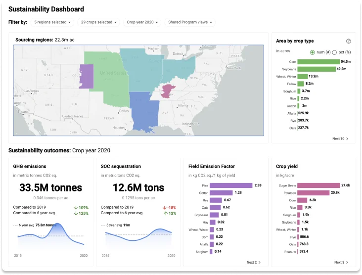 Regrow 的數位儀表板,提供客戶供應鏈農場之關鍵永續和再生農業實踐的訊息,如覆蓋種植、減少耕作和減少化肥使用。 也評估了採用再生農法對溫室氣體 (GHG) 減排、碳封存、作物產量和排放因素的影響。照片來源:brproud