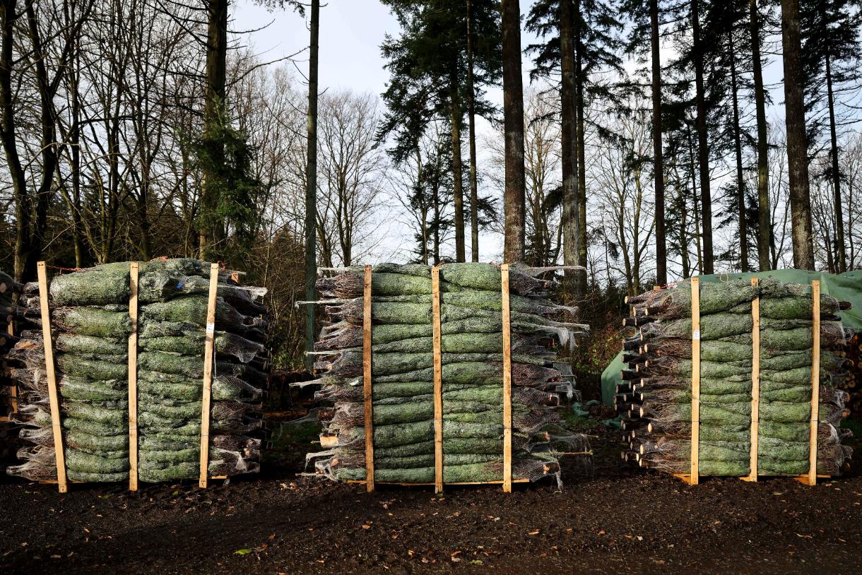 大批松樹被砍下來,要做成聖誕裝飾。森林生態學者認為,這種作法不見得不環保,樹木生長過程確實有參與碳循環。圖片來源/達志美聯社