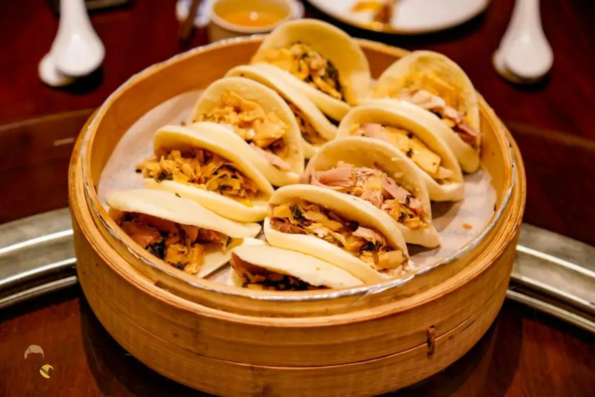 10大經典菜色之一的「金銀燒豬」,想吃必須提前2天預訂,是米其林指南推薦的招牌菜。主廚師承「蓬萊閣」老師傅,主要以閩式手法製作,工序相當繁瑣,幾乎需要耗時整天,因此這道功夫菜一度失傳五十多年,才在山海樓重現這道大菜。金銀燒豬可以做成3吃,一是吃豬皮的脆、二吃豬肋排的嫩,三是把剩下的肉用來炒酸菜,再夾入刈包一起享用。附上的4種沾醬各有不同風味,包含洋派的蜂蜜芥末、偏日式的檸檬醬、台式甜麵醬與醋蒜醬任君搭配。價格分為:1/4隻(4~6人份)3,880元、1/2隻(10~12人)6,560元、整隻(約20人)9,980元。