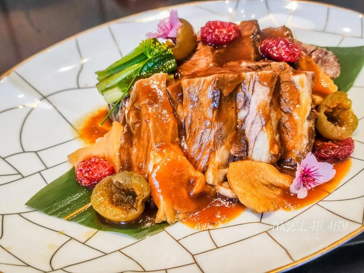▲「蓬萊牛肉」以台灣本土黃牛肋排,搭配以脆梅與鳳梨等水果熬煮的牛骨醬汁,酸甜開胃。(圖片來源:梅格Angelababy享樂日記)