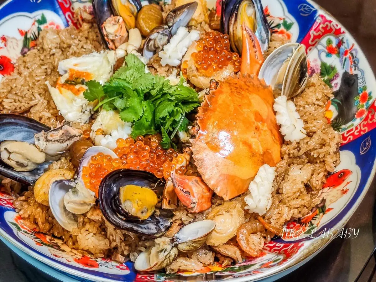 ▲「紅蟳極品海鮮米糕」集結台灣紅蟳、滷鮑魚、鹽味中卷、蒜味蛤蠣、日本鮭魚卵等海味好料。(圖片來源:梅格Angelababy享樂日記)