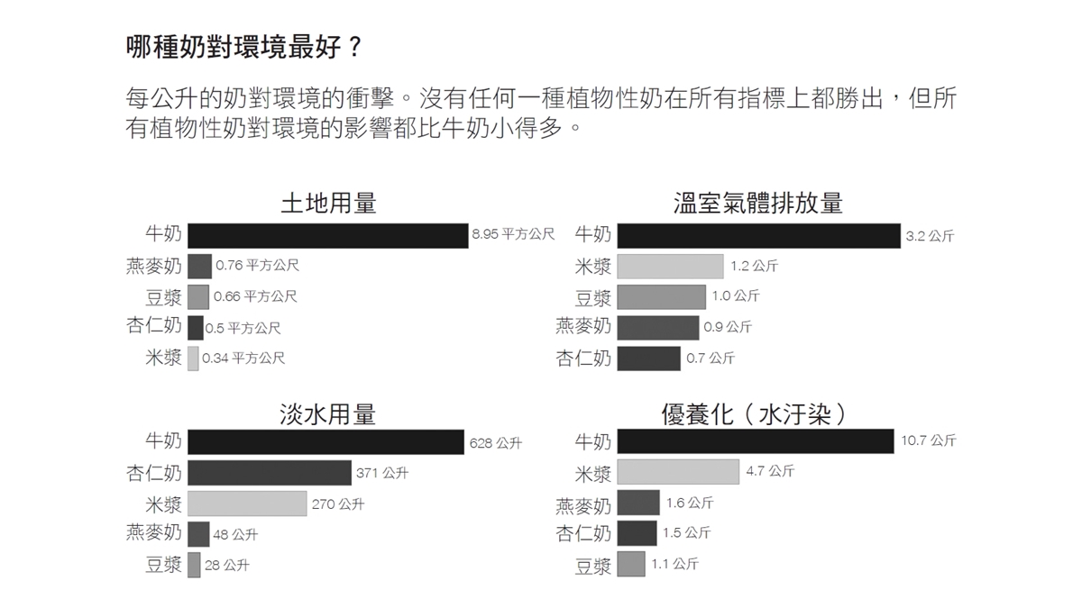 漢娜.瑞奇指出,牛奶的溫室氣體排放量,大約是植物奶的3倍,占用的土地面積大約是植物奶的10倍,所需的潔淨水量最多是植物奶的20倍,而且造成的優養化(過多養分汙染水源)程度也高得多。