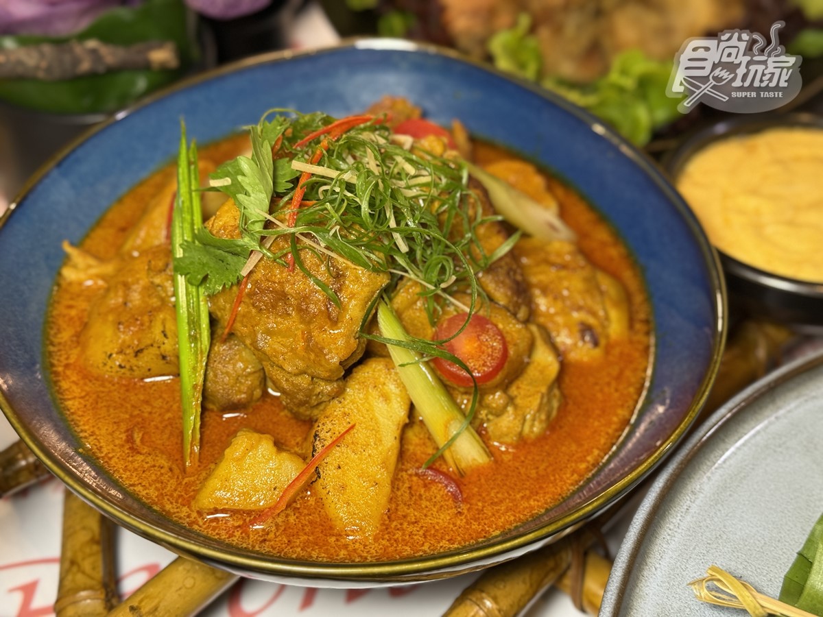 ▲主題季必吃菜色,推薦「星洲咖哩雞襯洋芋」(上)、「香蕉葉炙烤鮮魚烏達」(中)、「BBQ沙嗲」(下)等特色料理。(江亭儀 攝)