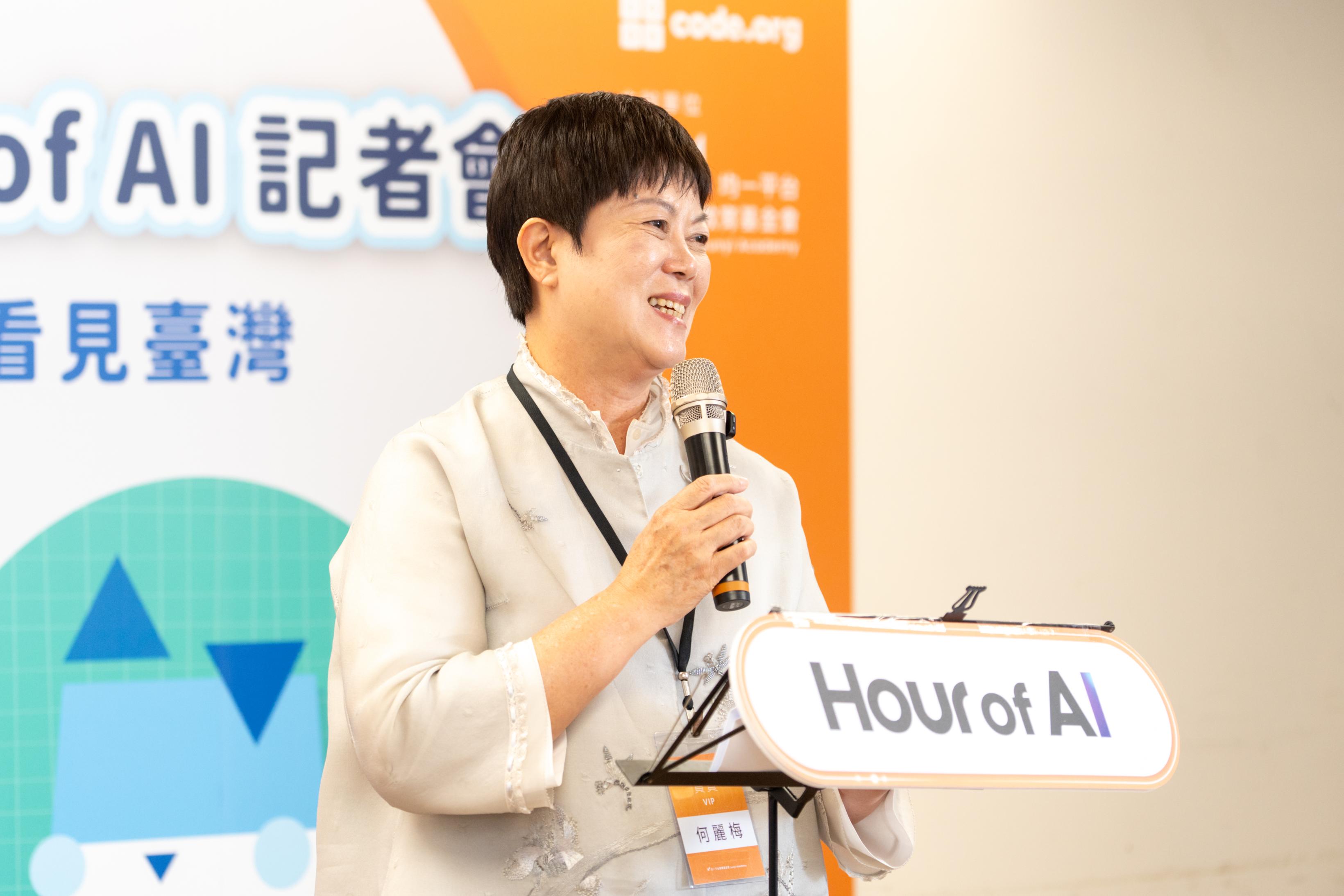 台積電資深副總何麗梅致詞表示,她代表台積電,也以均一平台董事身分,參與 「Hour of AI」台灣行動啟動。圖源:均一平台教育基金會