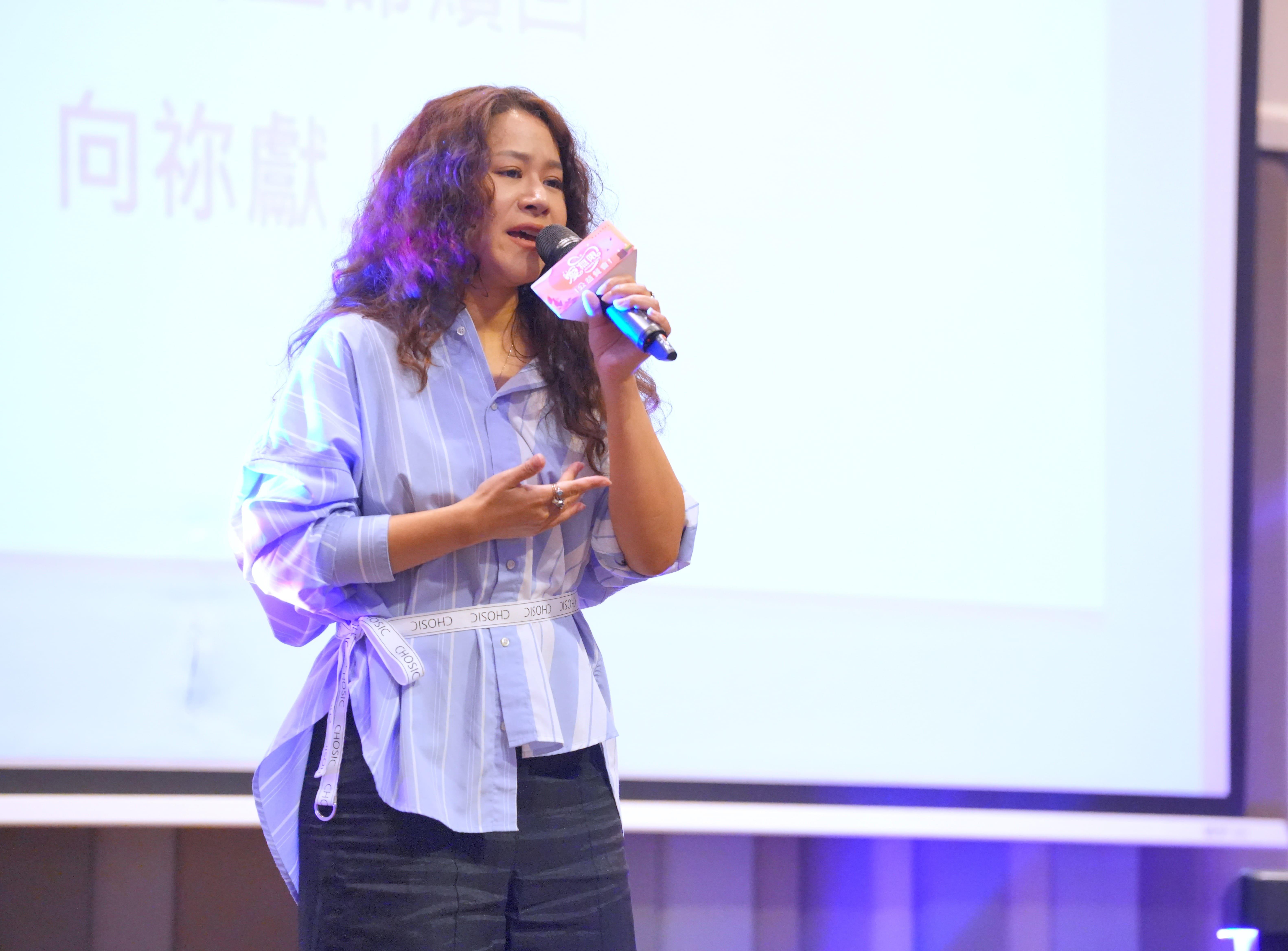 花蓮縣長徐榛蔚在台上開心唱歌,因為6號這場在花蓮舉辦的愛無限公益餐會,底下坐滿的,除了受助者,還有許多辛苦付出的社福人員。